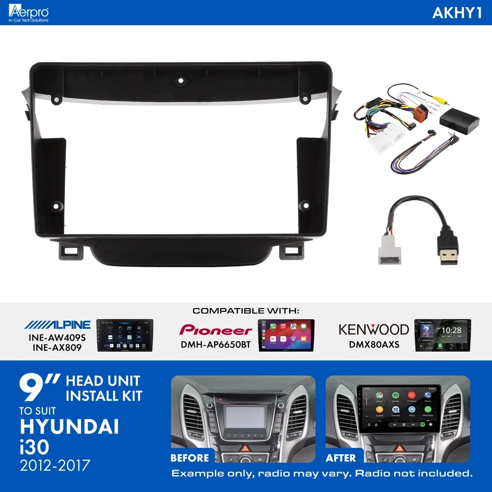 The Aerpro AKHY1 9" Installation Kit comes with all of the components required to install a 9" trapezoid shaped radio into your Hyundai i30 2012-2017 vehicles without factory navigation, whilst maintaining important vehicle features such as Steering Wheel Control functionality.