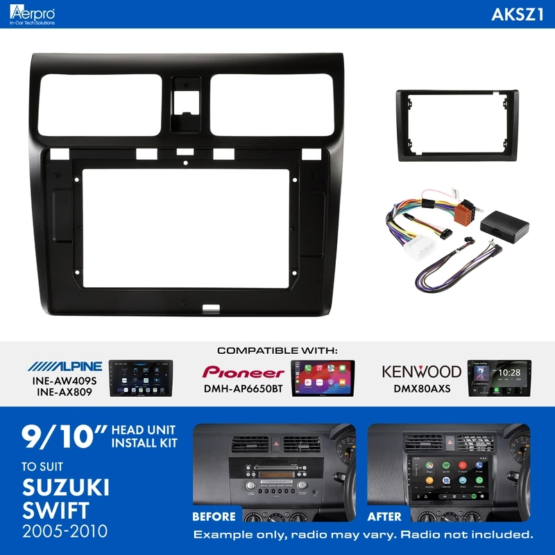 The Aerpro AKSZ1 9/10" Installation Kit comes with all of the components required to install a 9/10" trapezoid shaped radio into your Suzuku Swift (2005-2010) vehicles whilst maintaining important vehicle features such as Steering Wheel Control functionality.