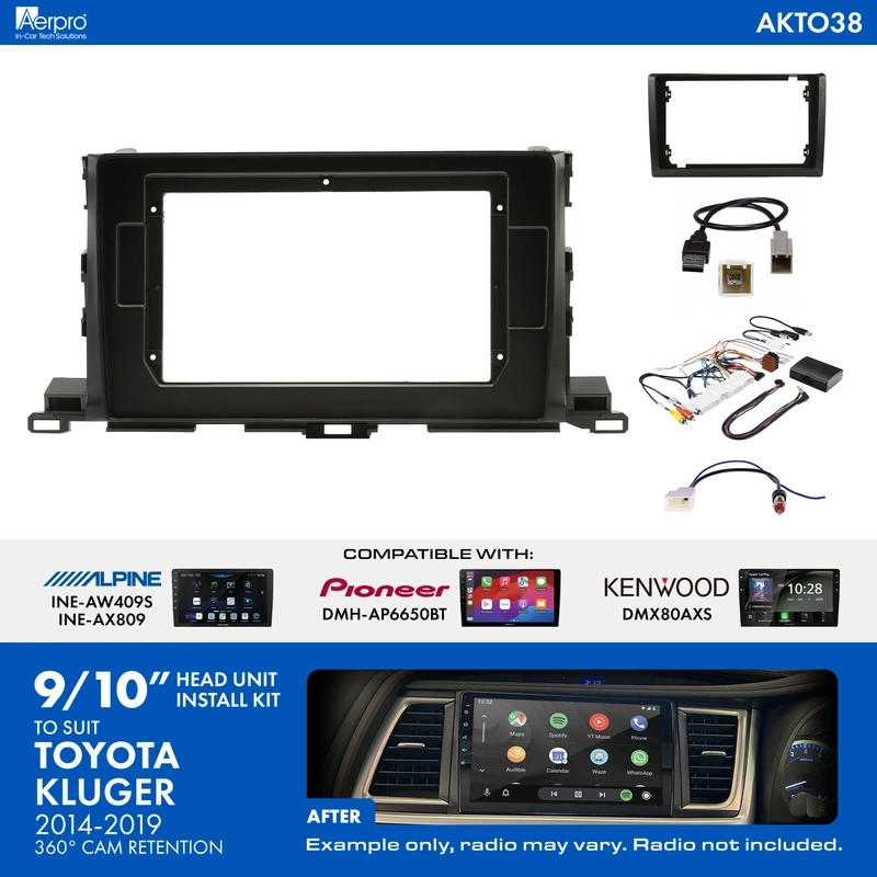 The Aerpro AKTO38 9/10" Installation Kit comes with all of the components required to install a 9/10" trapezoid shaped radio into your Toyota Kluger (2014-2019) vehicles with factory 360 camera, whilst maintaining important vehicle features such as Steering Wheel Control functionality.