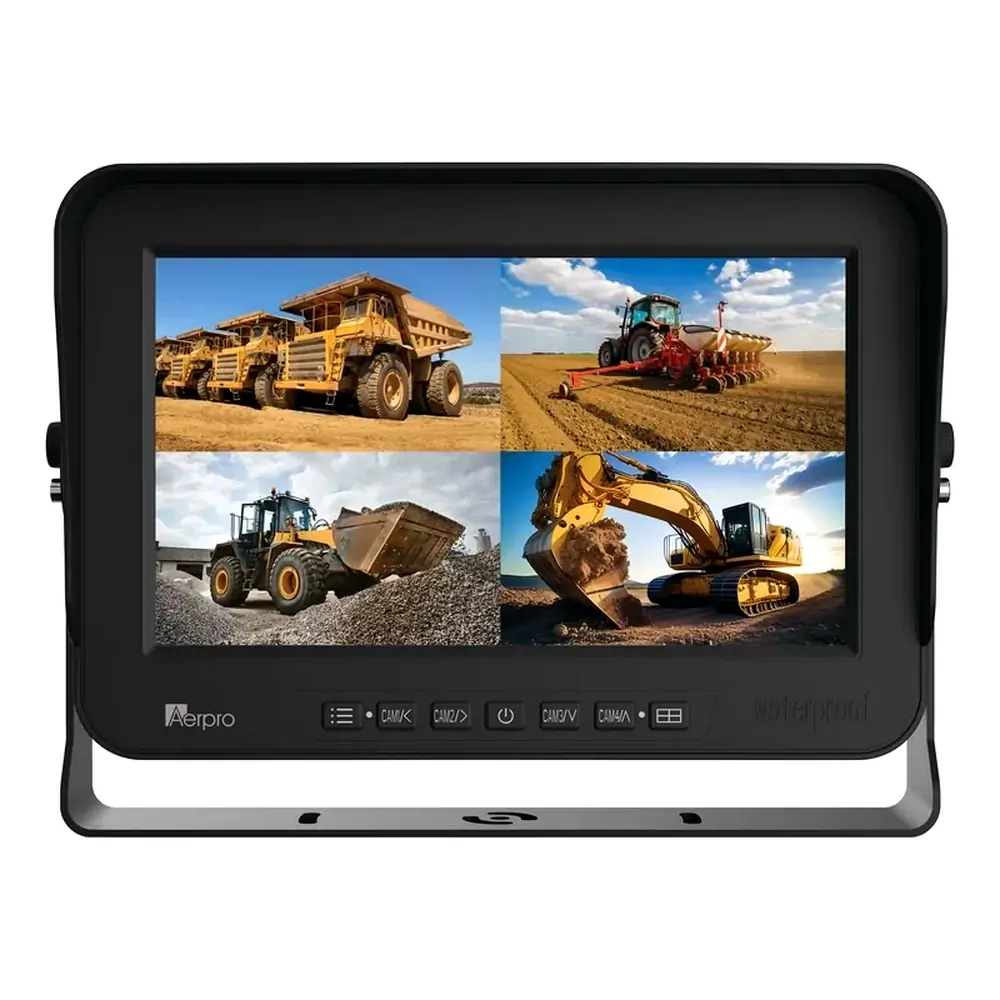 Installation is a breeze with the included dash-mount adjustable u-bracket and detachable sunshade, offering flexibility and optimal viewing angles. Featuring heavy-duty 4-pin camera connectors, the AVM10E ensures reliable weatherproof connections. Compatible with 12V, and 24V systems, the AVM10E suits a wide range of vehicles including agricultural vehicles, heavy machinery, buses, trucks and more.