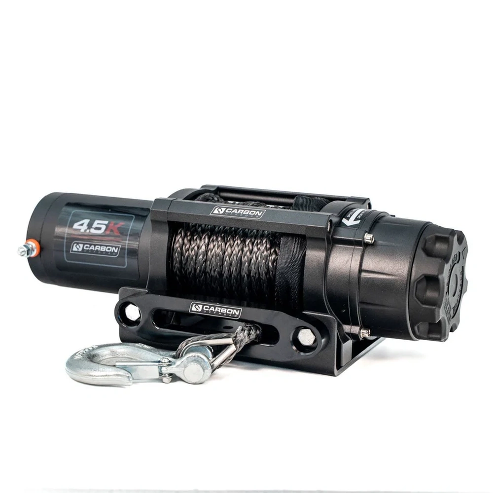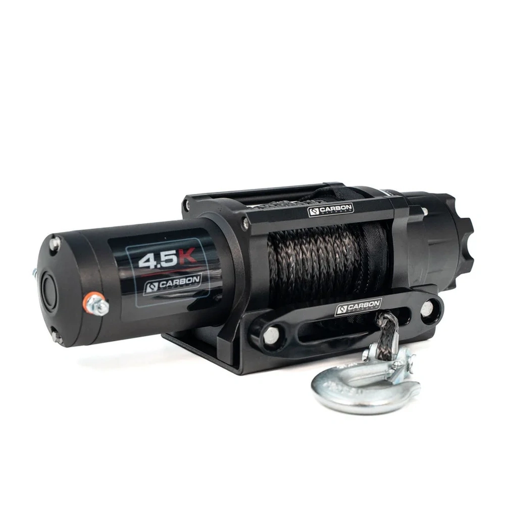 Carbon Offroad 4,500 lb ATV/UTV Winch – Compact, high-performance 12V winch with 3-stage planetary gearbox, synthetic rope, aluminium hawse fairlead, and wireless/handlebar controls. Ideal for trailers, ATVs, UTVs, and heavy-duty recovery.