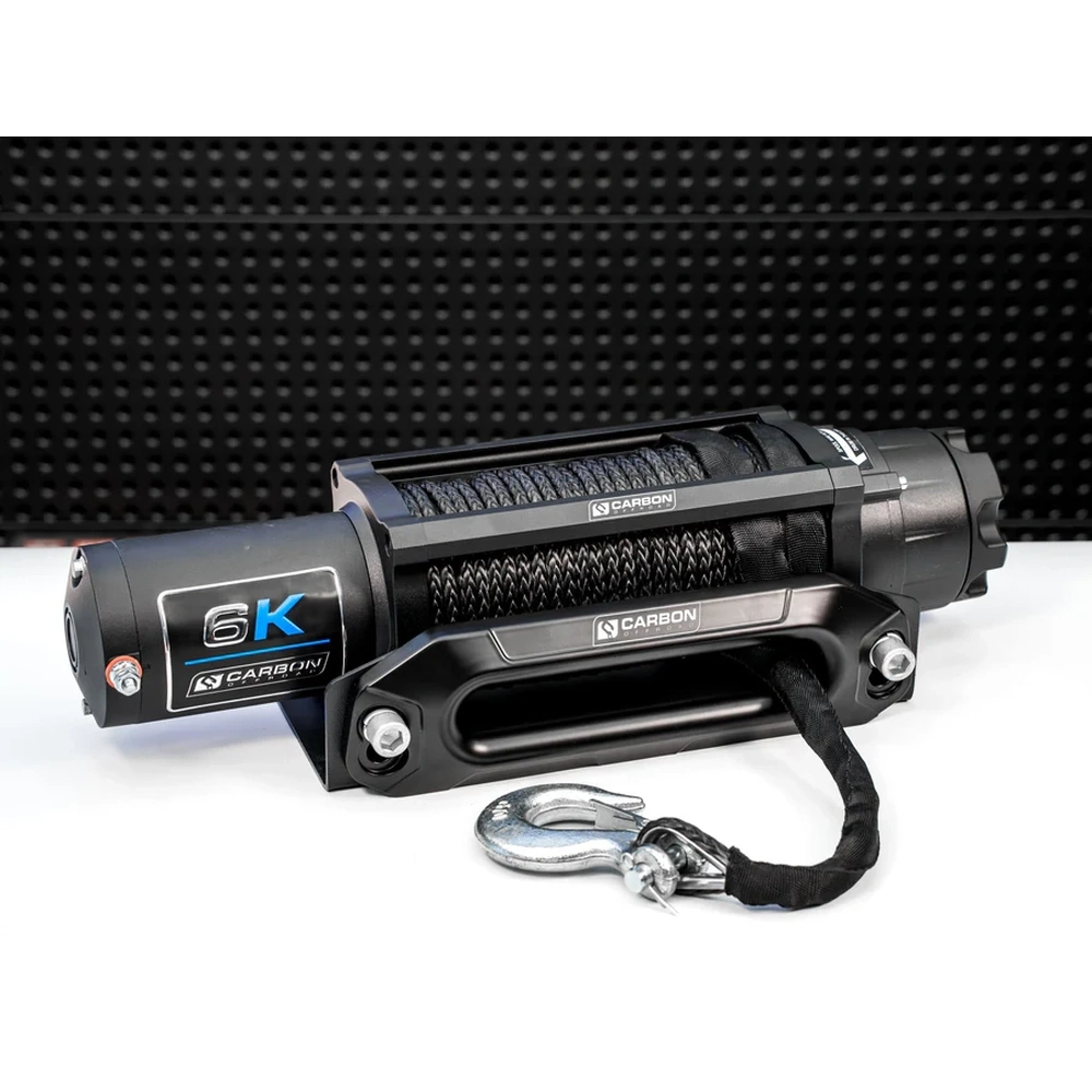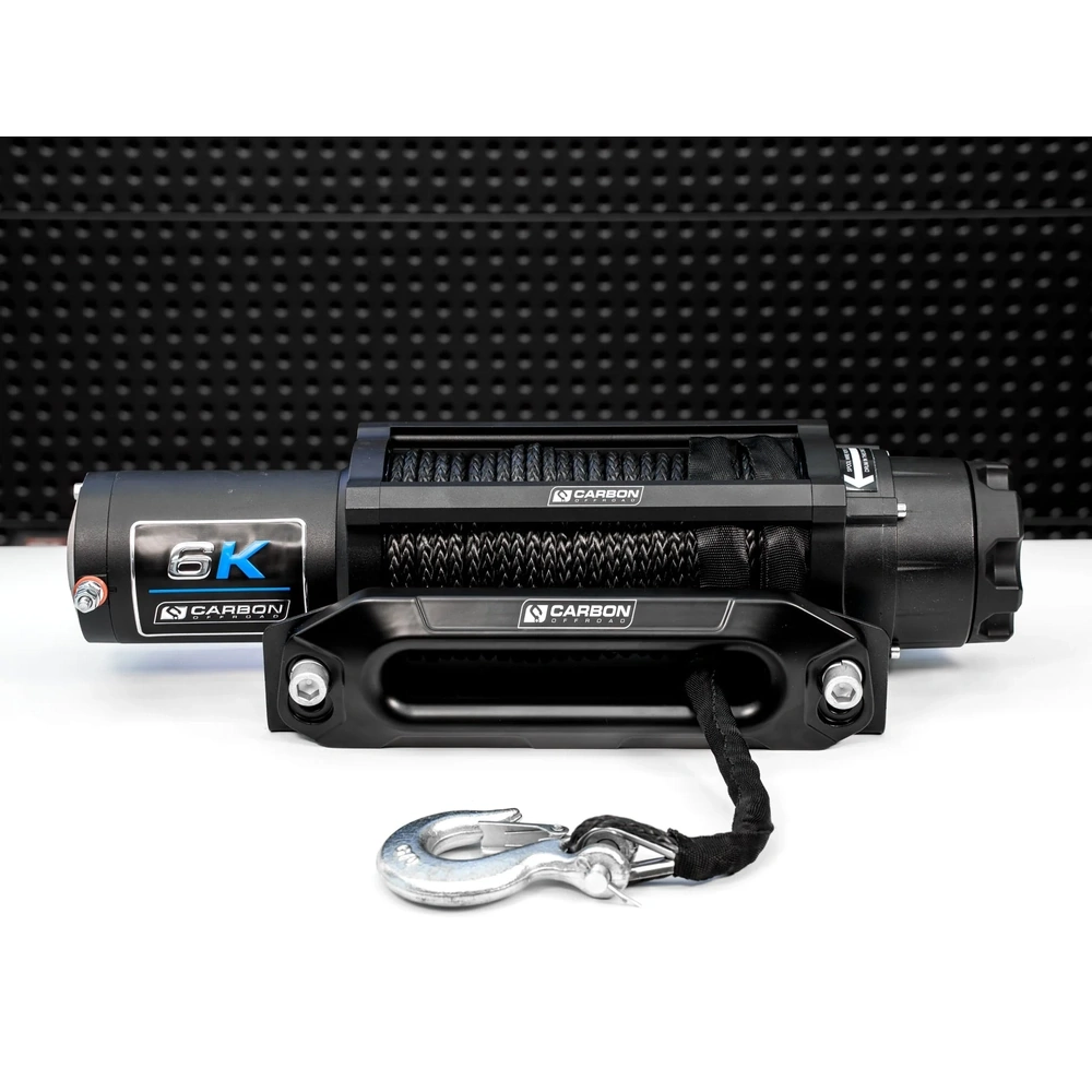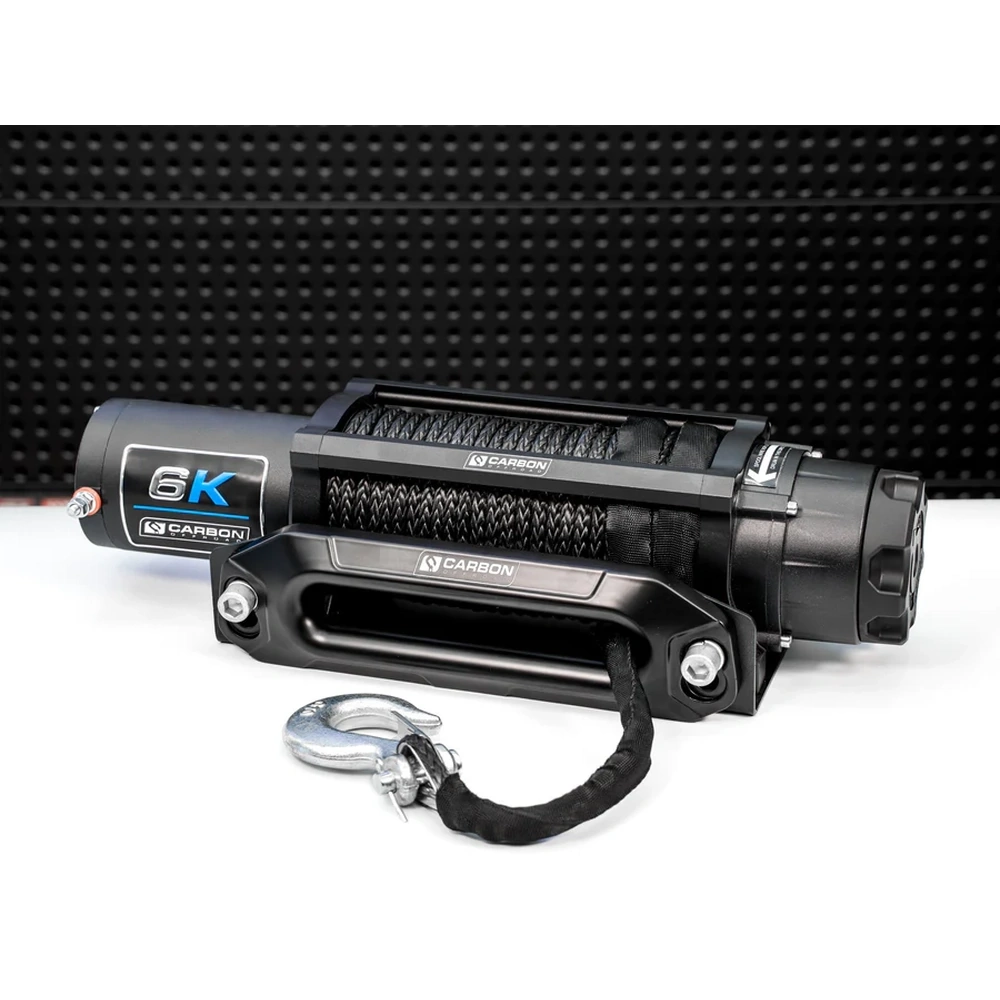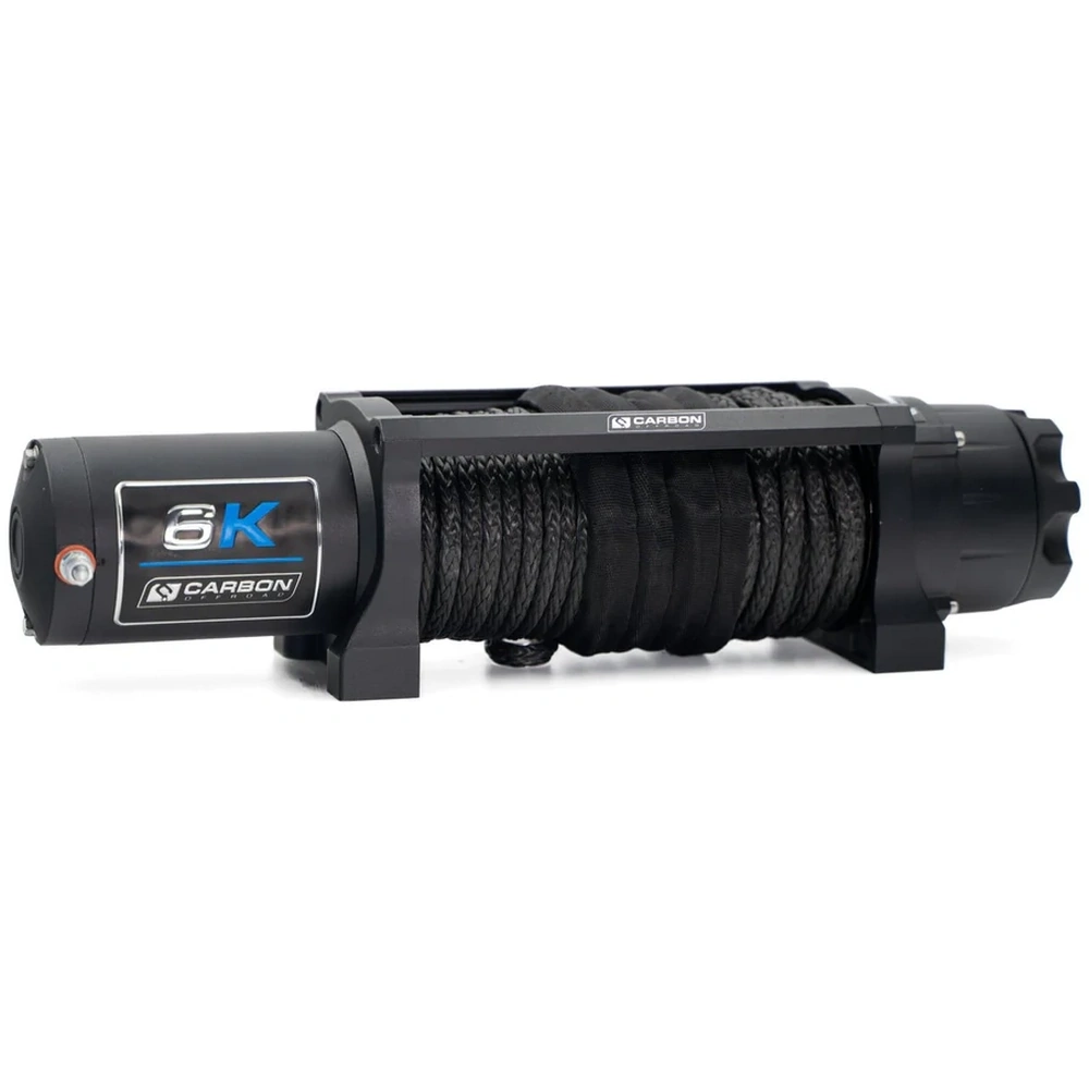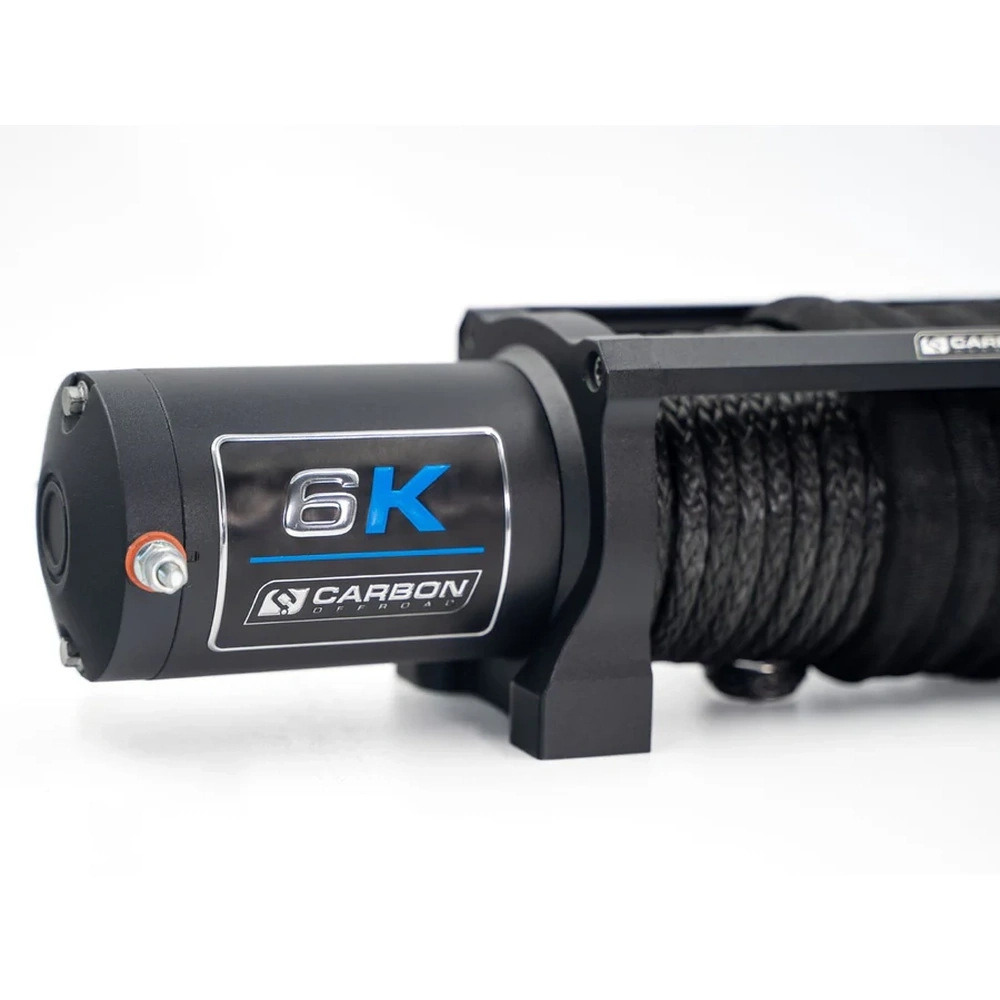 Carbon Offroad Long Drum 6K Winch – 6,000 lb winch with 26 m synthetic rope, sealed motor, dual remotes, and fail-safe braking. Perfect for ATVs, compact 4WDs, trailers, and boats needing extra line reach.