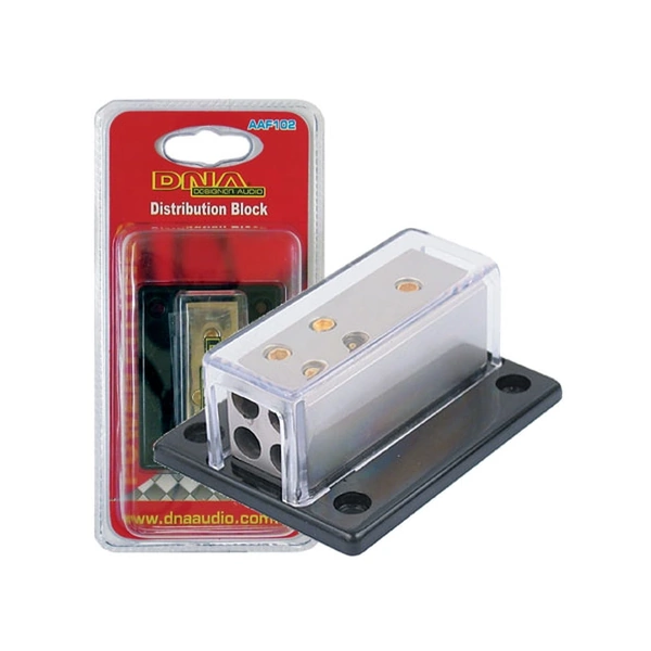 Accepts 1 x 4 gauge cable input to 4 x 8 gauge cable outputs gold allen key screw fittings clear ABS plastic base and clear perspex cover