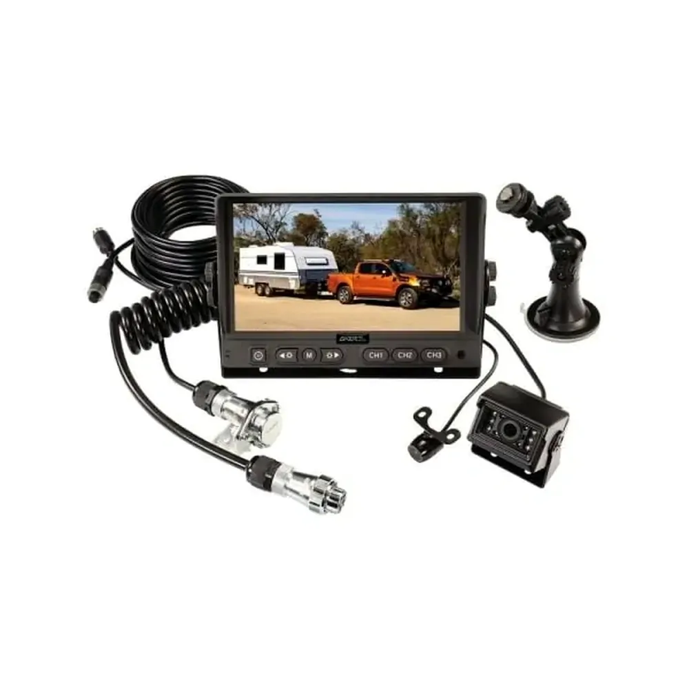 The Gator GRV70TKT Rear View Camera Kit is designed specifically for caravans and trailers. The kit comes supplied with everything required for simple installation and hassle-free operation. It includes a large 7" display which can be mounted on the dashboard or windscreen in the vehicle, as well as two cameras and a quick connect trailer system. The IP67 rated vehicle camera has a compact design for discreet installation and built-in parking guidelines to assist with reversing. The IP68 rated heavy duty trailer camera has built-in IR LEDs for improved night vision and parking guidelines for this camera can be activated via the menu settings in the display. The cameras automatically trigger when the reverse gear is engaged, with the trailer camera taking priority over the vehicle camera when connected. The display features a mirror image setting so the cameras can be used as reverse or rear view, as well as easy channel select buttons so the cameras can be activated on request. The system has a third camera input allowing an additional camera to be added if required and the system is12/24V compatible making it suitable for all types of vehicles.