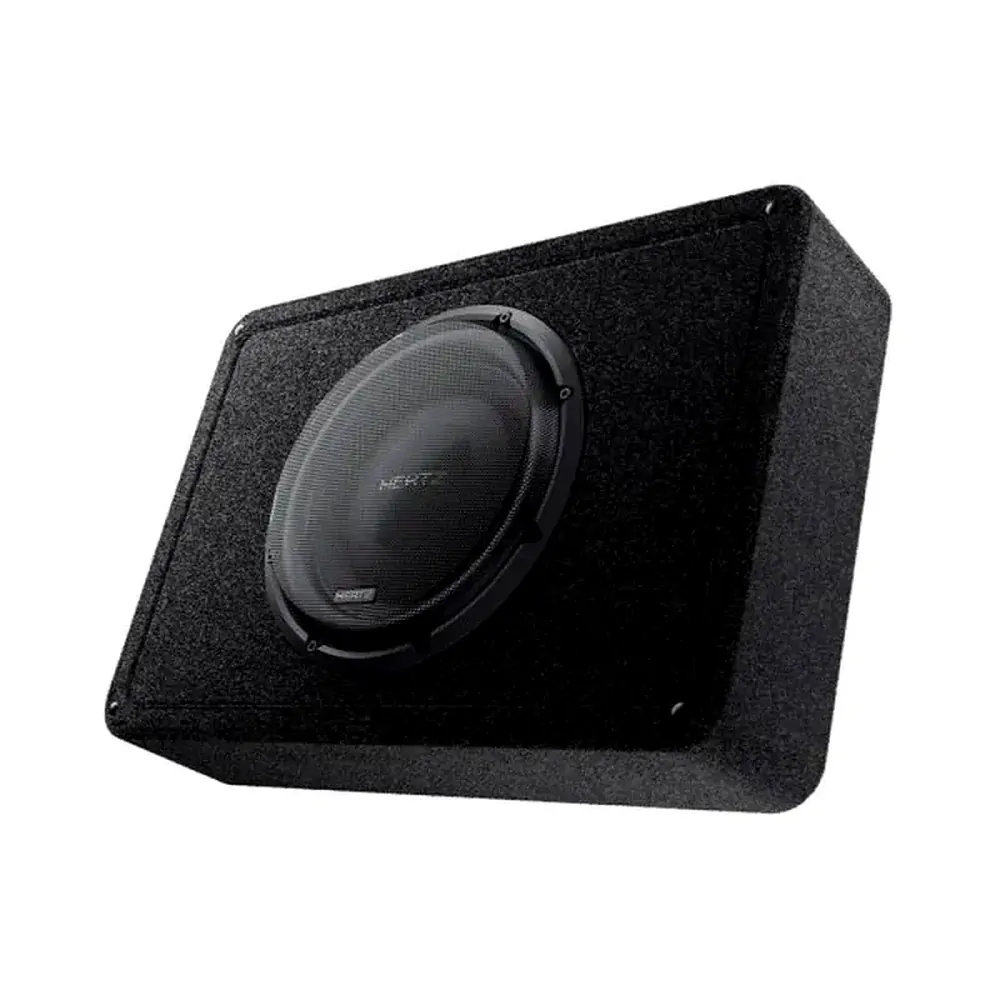 The Hertz MPBX2502 (MPBX 250 S2) ultra-shallow sealed enclosure is specifically optimised to deliver all the MPS 250 S2 subwoofer performances. The enclosure structure features incomparable robustness thanks to 15 mm (0.59 in.) wood thickness. Internal sound-absorbing material virtually increases the box's volume and reduces acoustic resonances. Panel-to-panel internal bracing with solid corners minimises resonances and round corners ease the placement. 2S2 (2 Sides/2 Sounds) design provides the ability to choose between down-firing mounting, through supplied feet with hook-and-loop inserts, to increase the low-frequency extension, and up-firing installation to obtain more punch and definition. SSP (Sub Smart Plug) features both plug-and-play terminal block and traditional push terminals providing bulletproof connection and quick release.