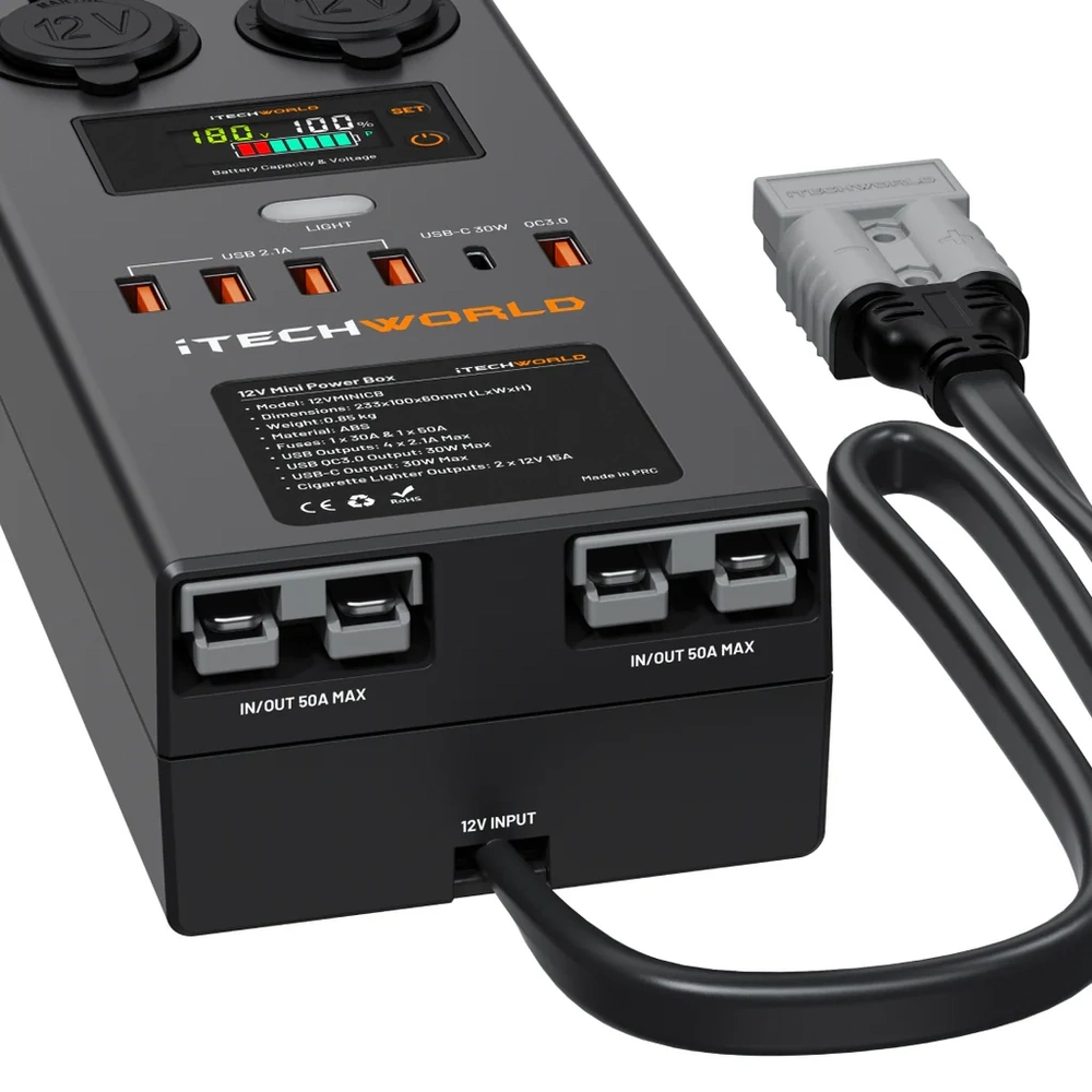 The iTechworld Mini Control Box is equipped with a 50A automatically resettable circuit breaker, it also includes a separate 30A fuse designed specifically for the female cigarette sockets.