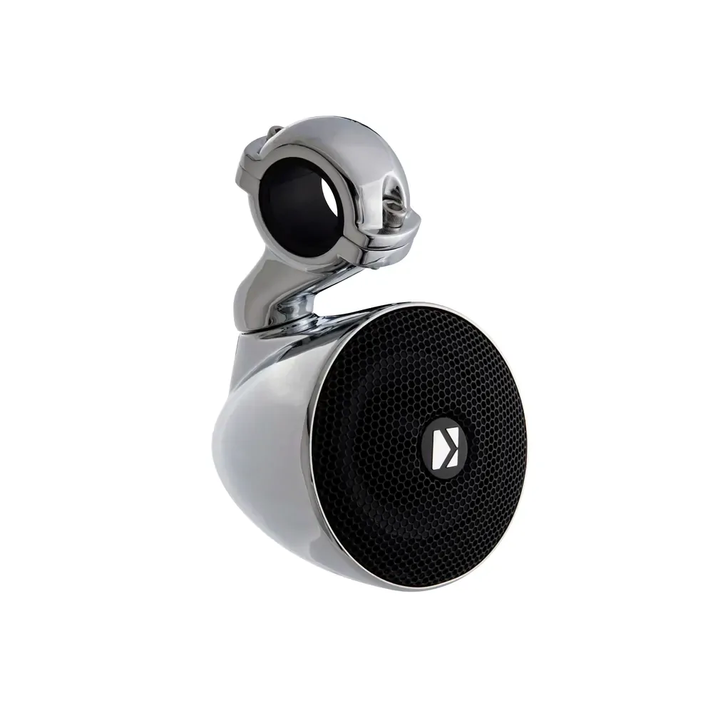 These weatherproof speakers come in durable chromed enclosures, complete with handlebar mounting hardware.