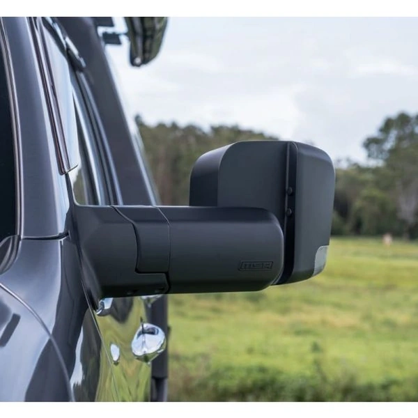 The large single mirror lens creates less confusion and enhanced safety while driving. The four, easily adjustable positions, provide greater vision, with less vibration to any towing situation, while maintaining ADR compliance and safety. When the mirror is rotated into the horizontal position, the mirror's actuator automatically adapts, allowing for standard adjustments (up, down, side to side) from the vehicle's standard mirror controller. This caters to drivers of differing height and seated positions. Designed to fold inwards or outwards when bumped in car parks, or when contact is made with trees and other obstacles around the vehicle. Simple to fit. MSA 4X4's Towing Mirrors mount onto a vehicle door in the same position as the existing mirrors. Most factory mirror functions are retained and come with the choice of black or chrome.The MSA 4X4 patented Towing Mirrors are manufactured extremely tough.Injection moulded and die cast aluminium components deliver a high-quality towing mirror to withstand Australian conditions. A great all-around mirror for towing caravans, camper trailers, trailers, boats and horse floats. Available to suit a growing range of towing vehicles.