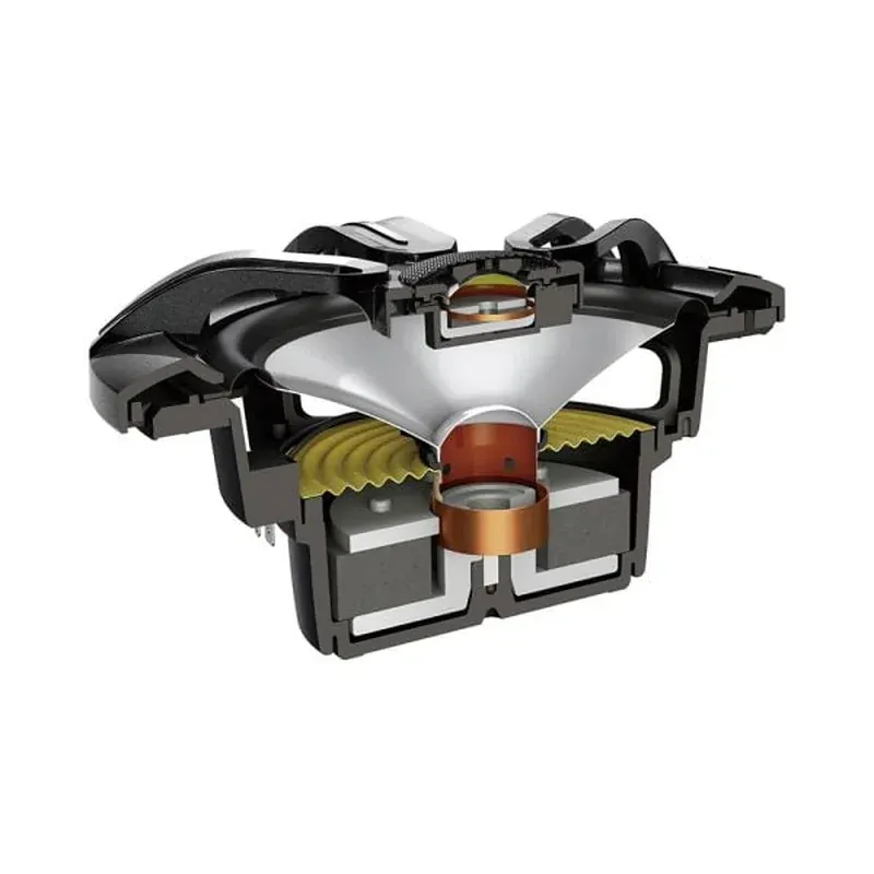 The symmetrical motor design with high strength suspension is optimized to provide stability, linearity and clear, low distortion sound reproduction. Lightweight polyimide (PI) tweeter diaphragm and uniquely shaped wave guide provides natural and clear vocals with wide dispersion.