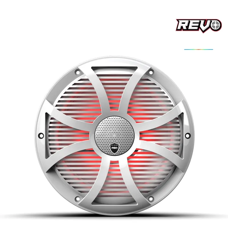 The LARGEST marine coaxial speaker, the REVO CX-10 Series features a high power design to deliver incredible sound! Using a powerful 10" mid driver with a full rubber santoprene spider & surround suspension system, heavy duty injection-molded composite frame, as well as a injection-molded composite cone and high output 1 1/4" titanium dome tweeter to give you the ultimate sound experience. Not only that, like with all REVO series speakers, you can go even further with the included R G B backlighting, giving you the ability to add some accent light in any color using a Wet Sounds R G B Controller (not included). This unique combination makes the REVO CX Series a TRUE High Performance Marine Class family of speakers. The REVO Series speakers are simply the BEST MADE & BEST PERFORMING marine speakers on the planet today! Available in 8 different grill options and colors to fit any style.